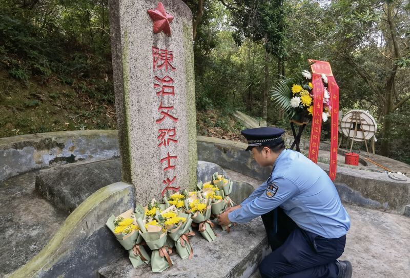 当天上午8时,民警们佩戴白色胸花,手持黄色菊丛,列队肃立在陈治文烈士墓碑前。党员民警李跃向大家深情地讲述陈治文烈士的英勇事迹。陈治文是深圳边防检查历史上第一位牺牲的烈士。1962年8月29日深圳罗湖口岸,一名潜伏特务企图混迹在人群中实施破坏,但被正在执行检查任务的陈治文识破。特务眼见阴谋暴露,当场引爆了手提箱中的炸弹。陈治文不幸壮烈牺牲,年仅29岁。