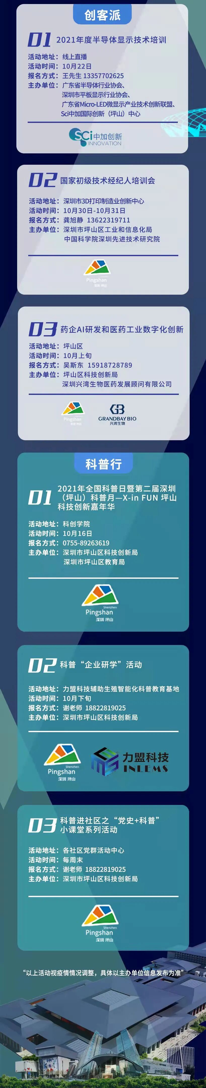 金秋十月,2021年全国科普日暨第二届深圳(坪山)科普月活动迎来高潮。4大主题、30场科技创新服务活动蓄势待发!