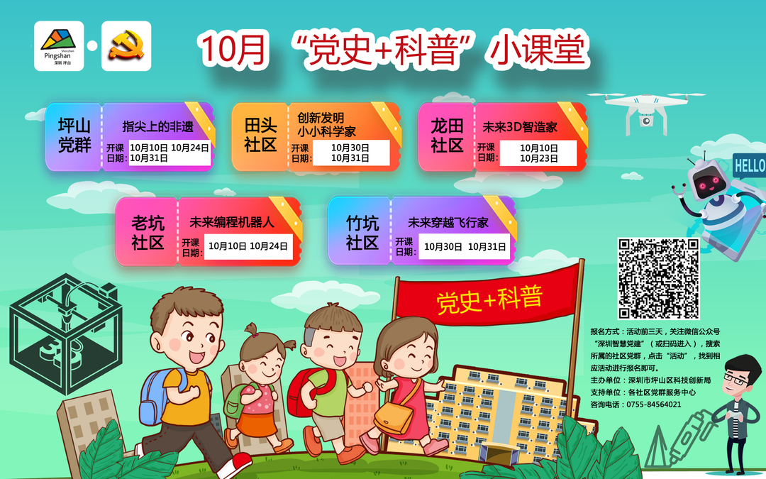 坪山区科技创新局主办的“党史+科普”小课堂活动正火热进行中,在今年1-9月已于6个社区开展共计65节科普小课堂,10月将继续走进各社区党群活动中心,为青少年儿童开展类型多样、主题鲜明的科普活动,为孩子们插上创新的翅膀、一起翱翔蔚蓝的科技之空。