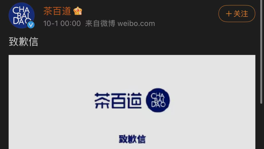 茶百道官方微博1日凌晨发布致歉信称,将对所有店铺进行全面排查,严格整改,不符合要求的门店一律采取闭店处理。