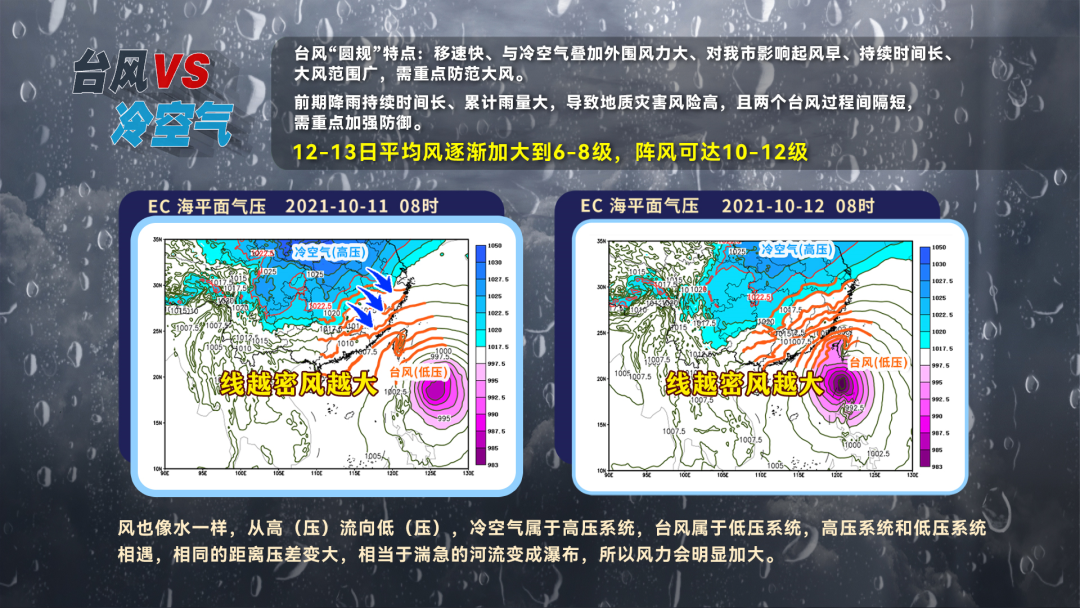 风也像水一样,从高(压)流向低(压),冷空气属于高压系统,台风属于低压系统,当高压系统与低压系统相遇,相同的距离压差变大,相当于湍急的河流变成瀑布,所以风力会明显加大。