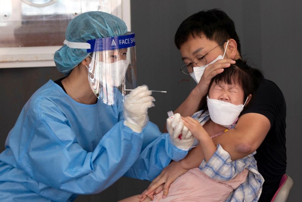 9月18日,在韩国首尔火车站附近,一名医护人员给一个小朋友做核酸检测。(新华社发,徐儒锡摄)