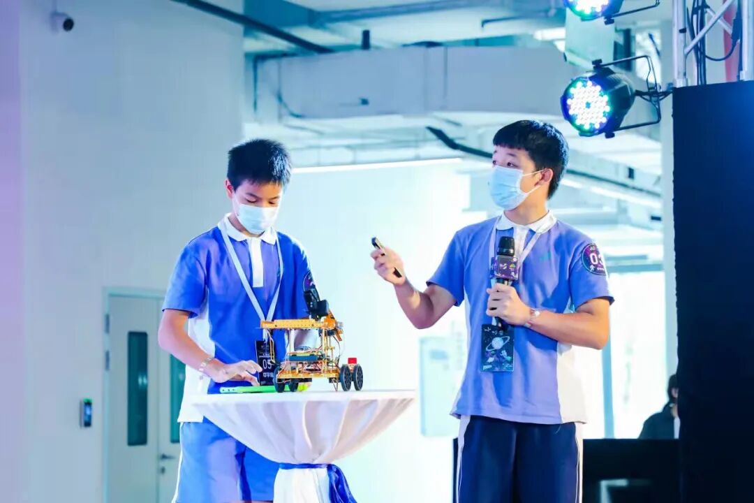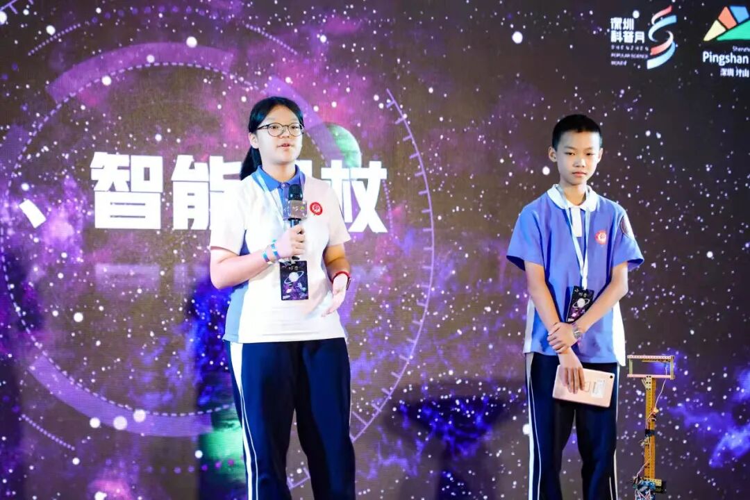 来自坪山中学八年级的高荣信、蔡沁薇则从日常生活出发,由于观察到需要使用拐杖辅助行动的同学面临诸多不便,他们设计制作了一款“智能拐杖”,“这样一来,拐杖平时可以折叠置放在教室后面,不挡道。同学需要起身,通过遥控就能让拐杖自动来到身边,回家晚了还可以打开小灯照明。”高荣信说,“我们希望运用科技为大家的生活带来更多便利,让大家得到更多的关怀。”