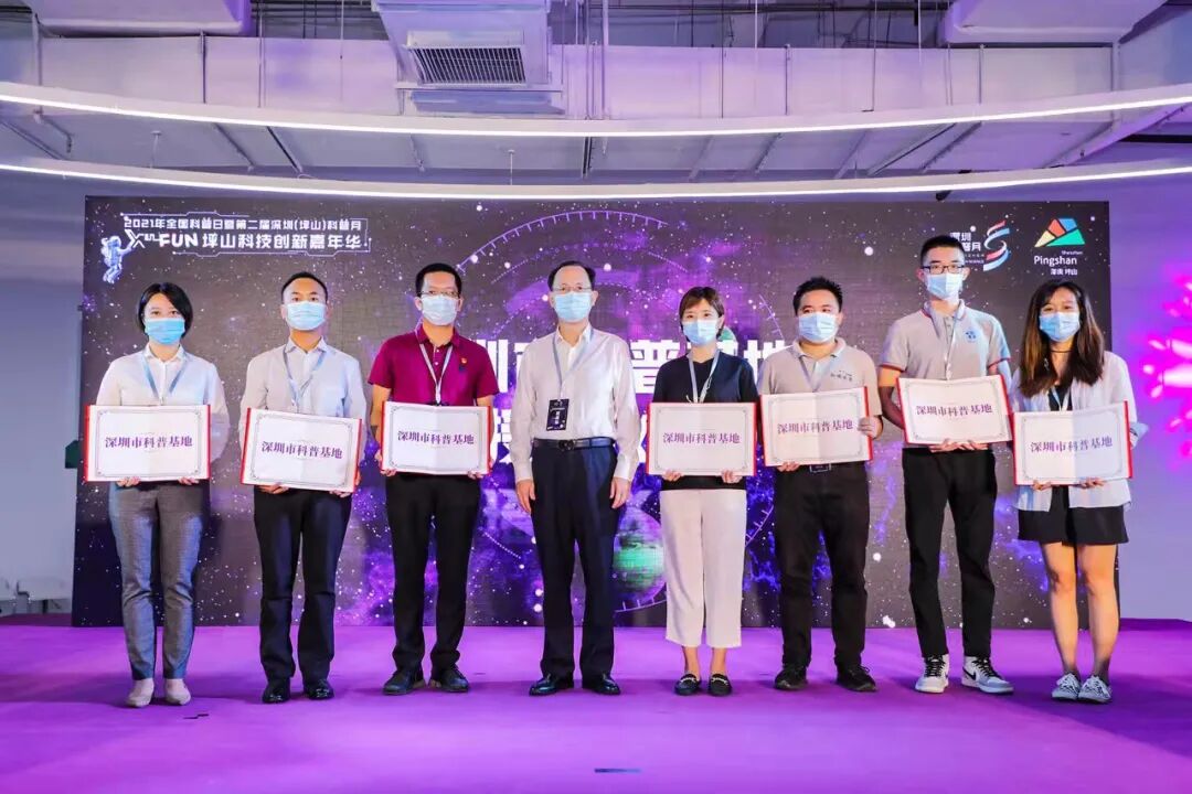 嘉年华开幕式上,力盟生命科技(深圳)有限公司、深圳市光韵达增材制造研究院、深圳市和顺本草药业有限公司、北京中医药大学坪山国医堂中医门诊部、深圳市坪山实验学校、深圳市坪山区城市管理和综合执法局(垃圾分类体验馆)、齐心商用设备(深圳)有限公司共7个深圳市科普基地以及深圳市坪山区中山中学一个深圳市科普示范点正式揭牌。