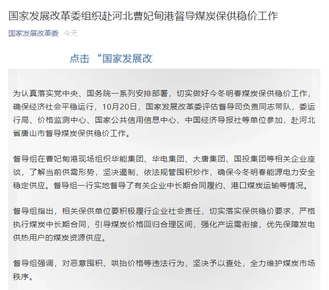 为认真落实党中央、国务院一系列安排部署,切实做好今冬明春煤炭保供稳价工作,确保经济社会平稳运行,10月20日,国家发展改革委评估督导司负责同志带队,委运行局、价格监测中心、国家公共信用信息中心、中国经济导报社等单位参加,赴河北省唐山市督导煤炭保供稳价工作。