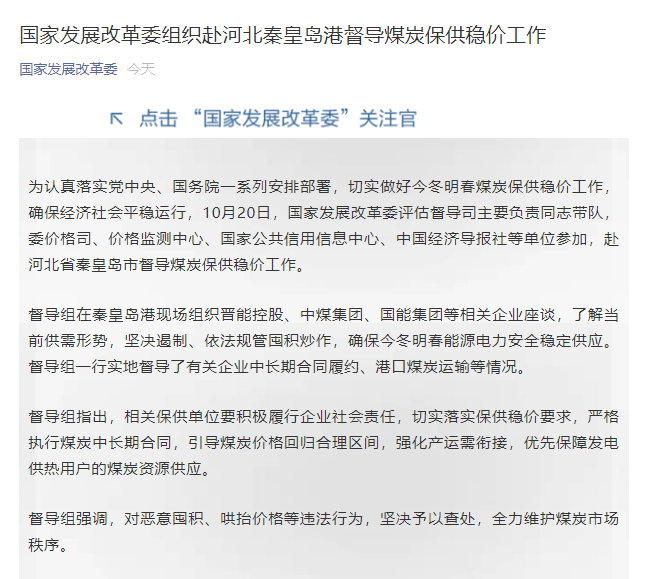 为认真落实党中央、国务院一系列安排部署,切实做好今冬明春煤炭保供稳价工作,确保经济社会平稳运行,10月20日,国家发展改革委评估督导司主要负责同志带队,委价格司、价格监测中心、国家公共信用信息中心、中国经济导报社等单位参加,赴河北省秦皇岛市督导煤炭保供稳价工作。