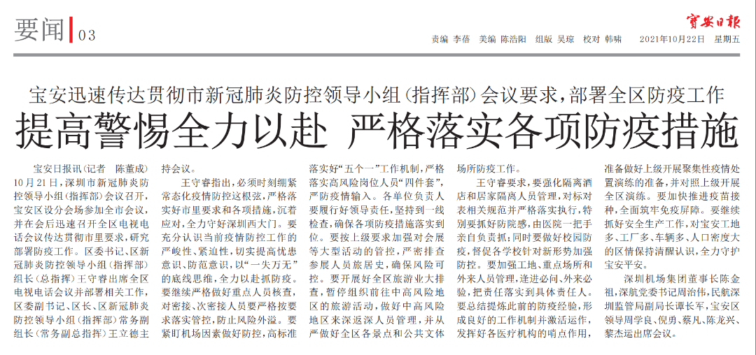 10月21日,深圳市新冠肺炎防控领导小组(指挥部)会议召开,宝安区设分会场参加全市会议。会后,宝安迅速召开全区电视电话会议传达贯彻市里要求,研究部署防疫工作。区委书记、区新冠肺炎防控领导小组(指挥部)组长(总指挥)王守睿要求,必须时刻绷紧常态化疫情防控这根弦,严格落实好市里要求和各项措施,沉着应对,全力守好深圳西大门。开展好全区旅游业大排查,暂停组织前往中高风险地区的旅游活动,做好中高风险地区来深返深人员管理,并从严做好全区各景点和公共文体场所防疫工作。
