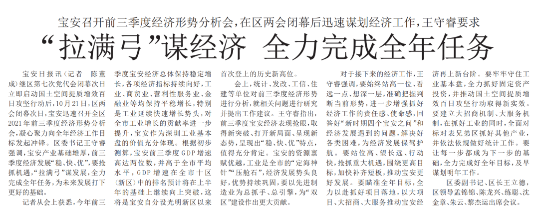 前三季度宝安经济持续向好,GDP增速实现新的突破,呈现一派欣欣向荣的发展态势。这为我们冲刺完成全年任务奠定坚实基础,也给宝安注入再攀高峰的强大信心和战胜困难的巨大勇气。宝安将瞄准全年发展目标,全力以赴抓好项目落地,以大项目、大招商、大服务推动宝安经济再上新台阶。坚持以先进制造业为总抓手、总引擎,持续巩固优势,攻克发展难题,加快补齐短板,加快构建新发展格局,推动宝安经济实现“全年红”。