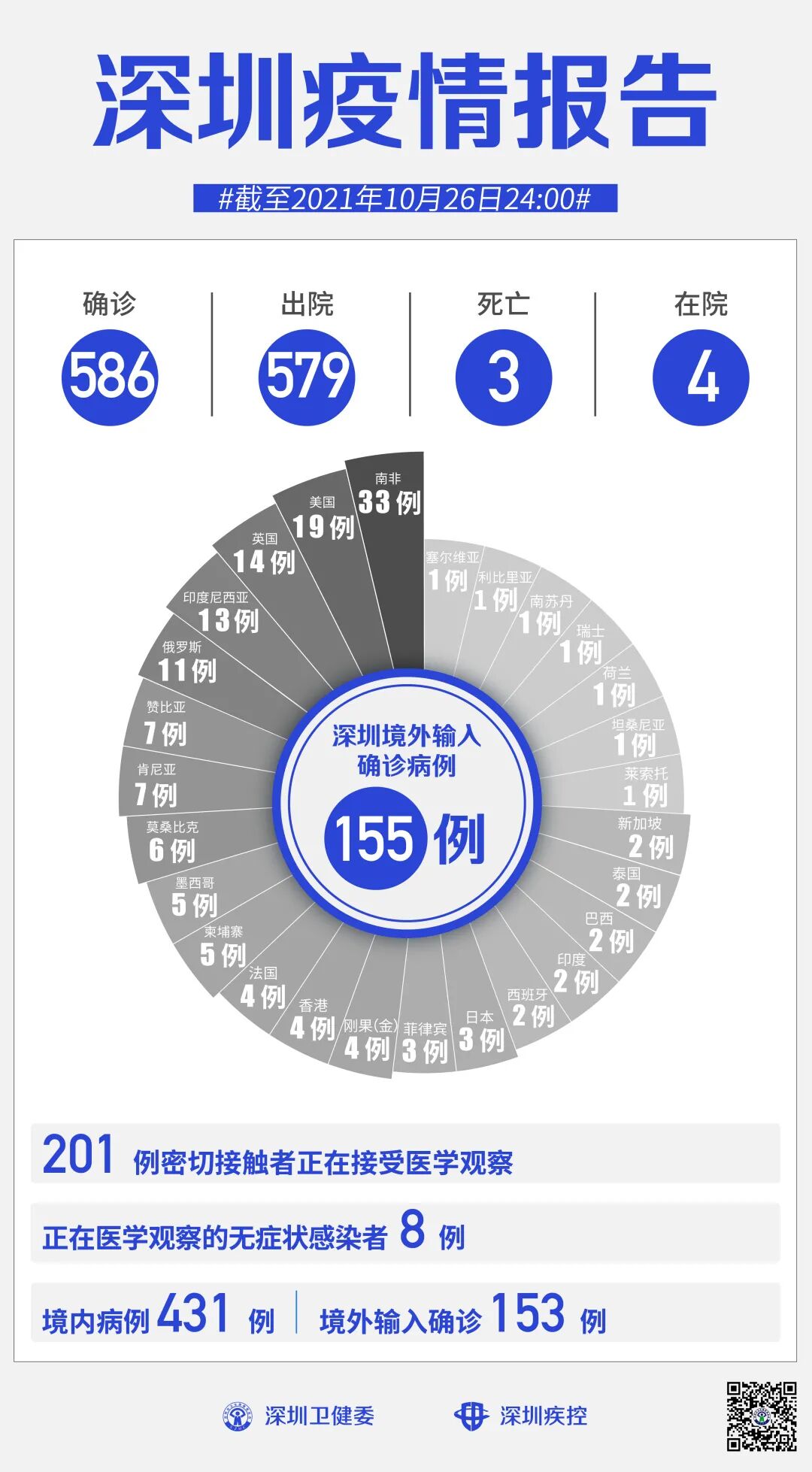 截至10月26日24时,深圳市累计报告新冠肺炎确诊病例586例。
