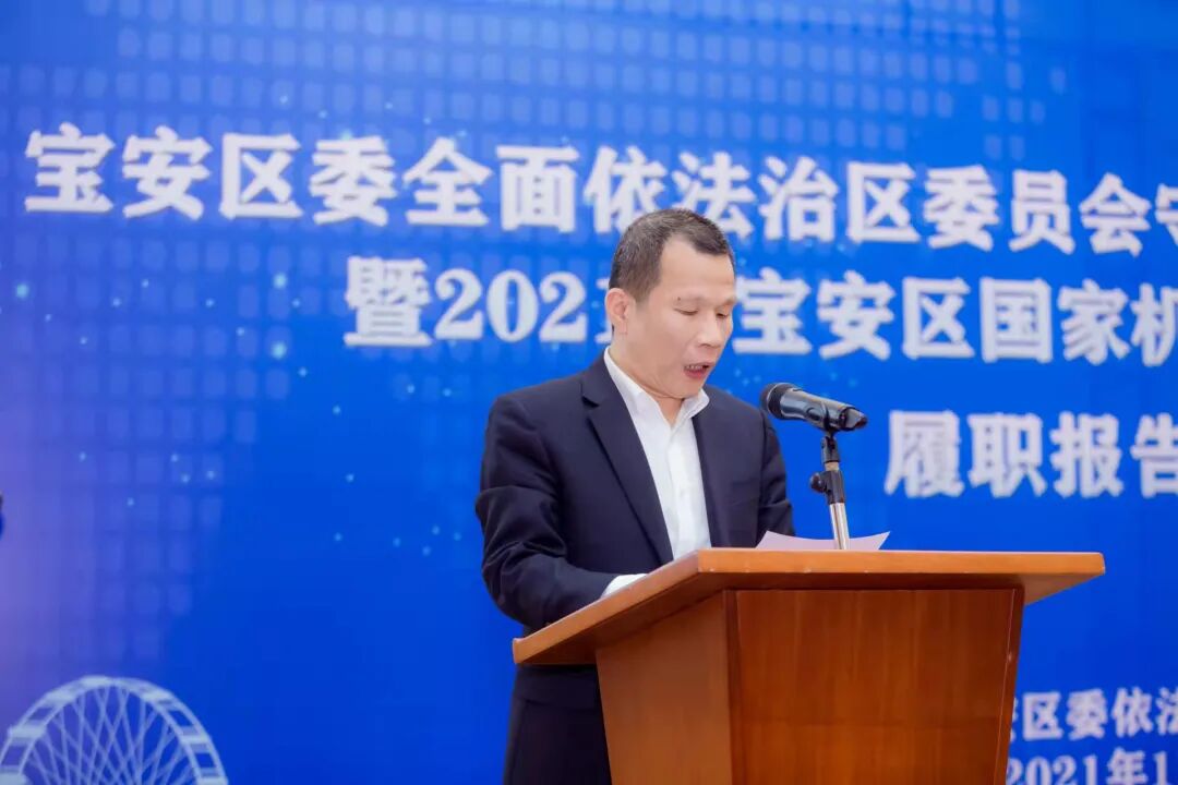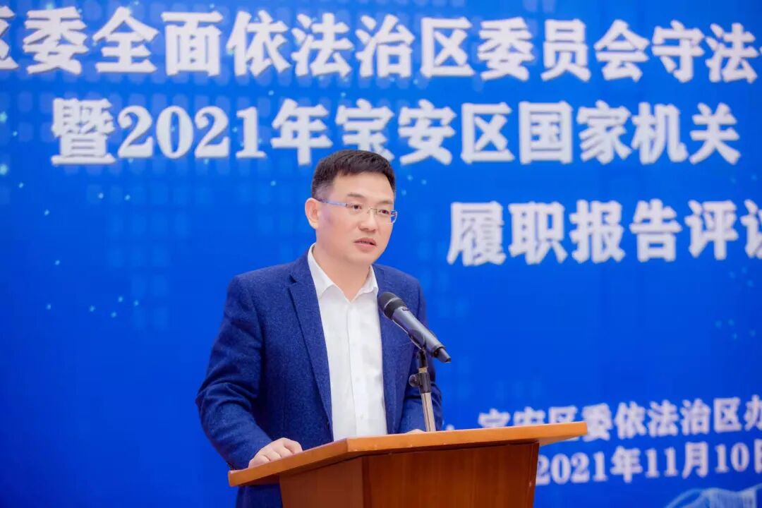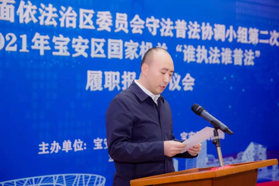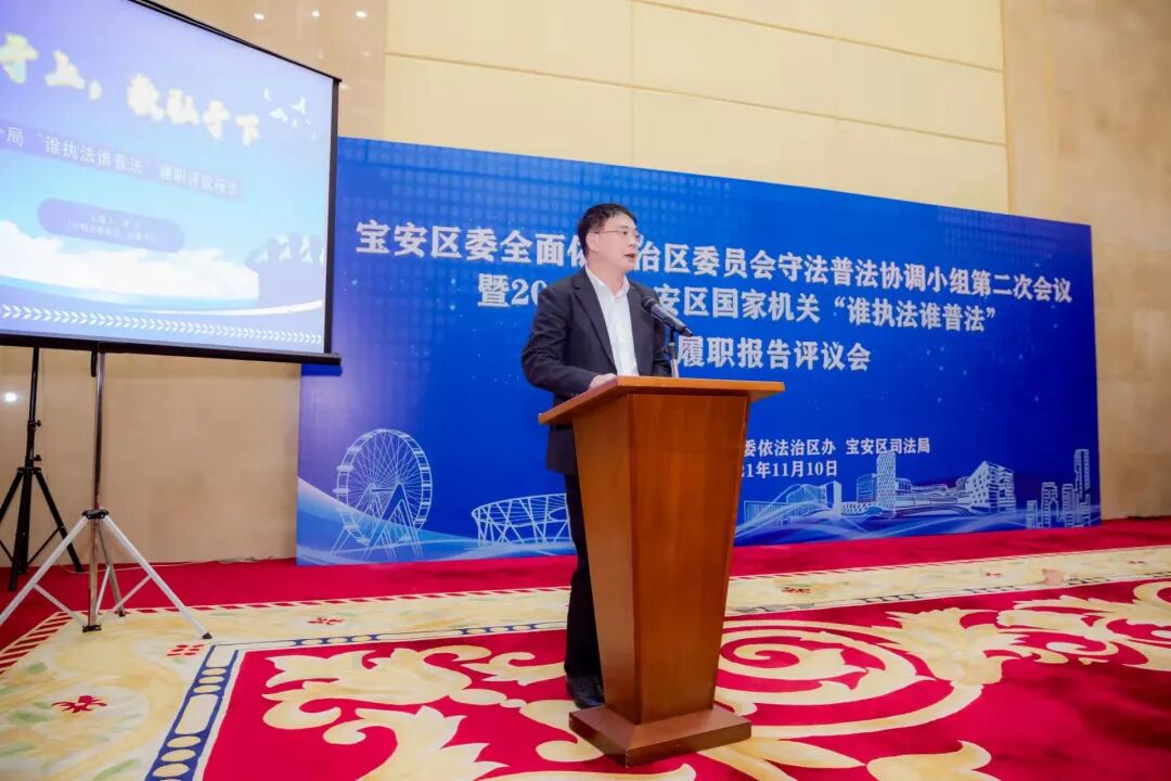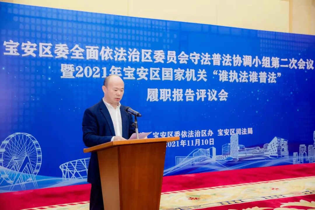 11月10日下午,宝安区委全面依法治区委员会守法普法协调小组第二次会议暨2021年宝安区国家机关“谁执法谁普法”履职报告评议会在宝安区委区政府宝安厅举行。