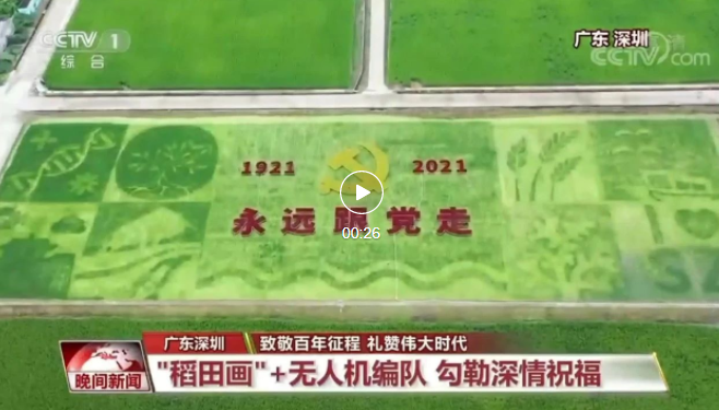 “七一”当天,精心策划7000平米高科技稻田画,深情表白党的百岁生日,成为“七一”当晚央视一套《致敬百年征程 礼赞伟大时代》新闻头条,四套、十三套转载。