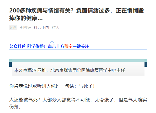 不光生气,很多负面情绪都与疾病有关。有人统计,200多种疾病与情绪有关。