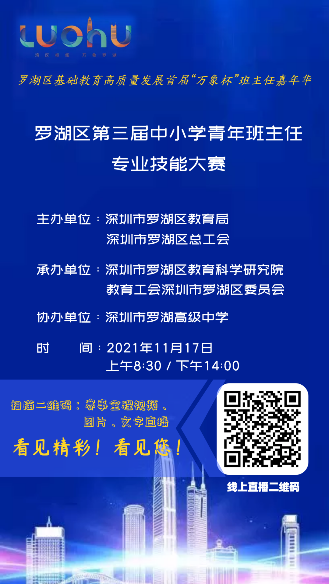 为贯彻习近平新时代中国特色社会主义思想和党的十九大精神,落实党的教育方针和教育部《中小学德育工作指南》有关要求,进一步加强罗湖区中小学班主任队伍建设,提高班主任思想政治素质、师德修养、理论功底和专业素养,加强青年班主任队伍梯队培养,区教育局、区总工会联合组织开展罗湖区第三届中小学青年班主任专业技能大赛。