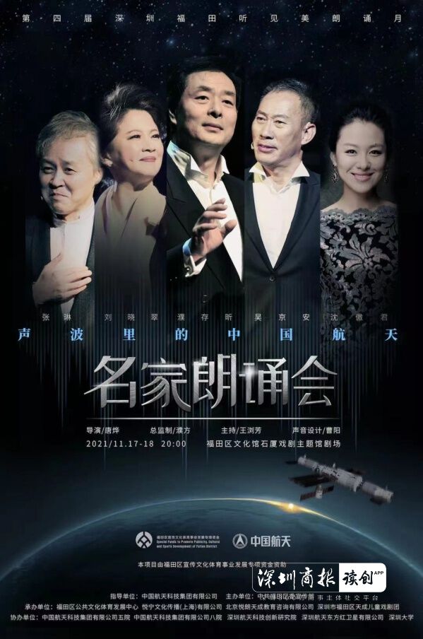 对此,朗诵会艺术总监,同时也是朗诵表演者的濮存昕表示,为中国航天发声深感荣幸,为中国航天取得的成就感到自豪和骄傲!演出当晚,他将为大家带来讲述钱学森艰难归国之路的《一封写在烟盒纸上的信》。此外,著名表演艺术家濮存昕与众多国家一级演员吴京安、沈傲君、张琳、刘晓翠等人将一一登场,讲述感动他们的中国航天故事。不仅拥有名家阵容,“声波里的中国航天”朗诵会还将迎来若干有故事的市民,他们是奋战在深圳航天战线上的从业者、深圳大学的学生、朗诵的爱好者,他们来自这座城市的不同角落,因对航天事业的热爱及对朗诵艺术的追求将聚集在一起,与名家共同勾画出一幅色彩斑斓的艺术图景。