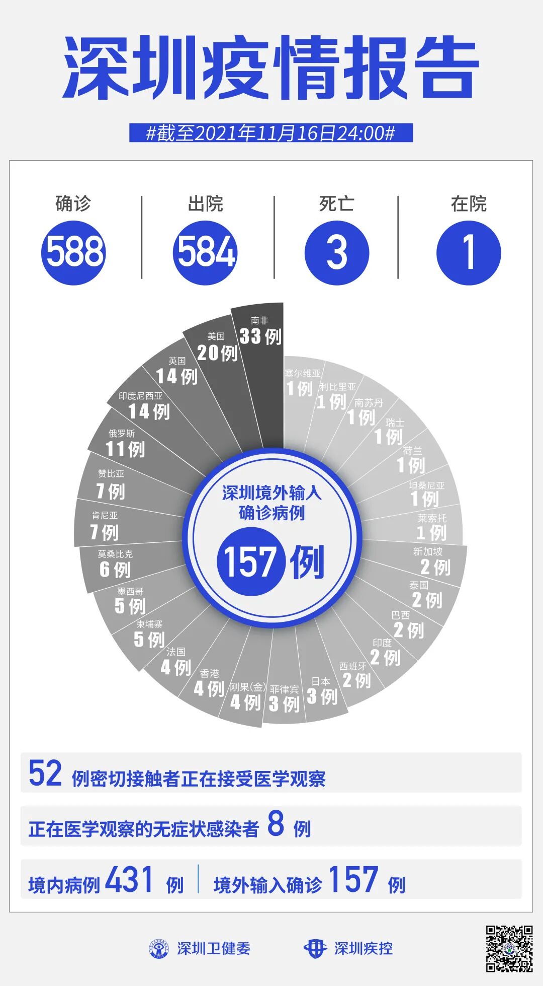 截至11月16日24时,深圳市累计报告新冠肺炎确诊病例588例。
