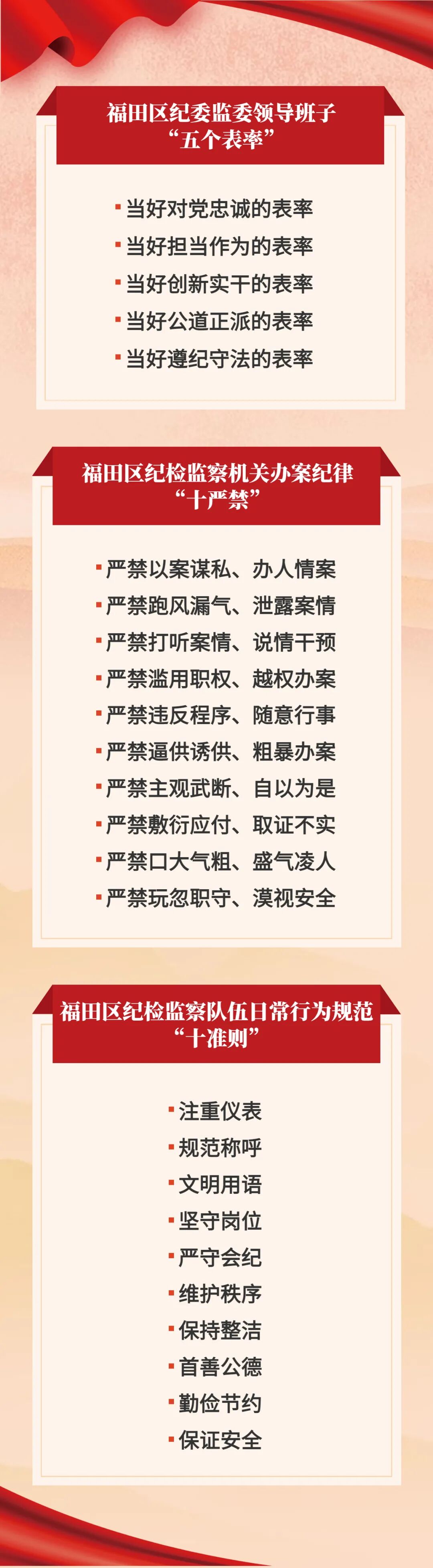 近日,福田区纪委监委出台了纪委监委领导班子“五个表率”、纪检监察机关办案纪律“十严禁”和纪检监察队伍日常行为规范“十准则”,对纪检监察干部队伍的监督管理立起了新标尺。