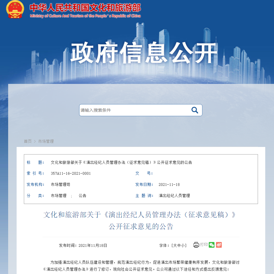 文化和旅游部关于《演出经纪人员管理办法(征求意见稿)》公开征求意见的公告