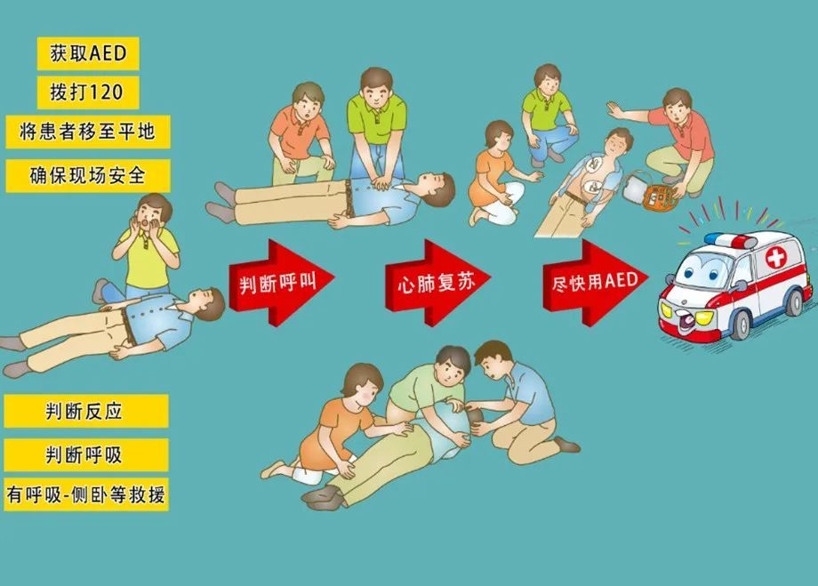 第三步:呼叫救援,请他人帮忙打120并取来AED(自动体外除颤仪)。