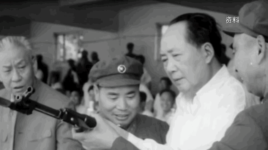 毛泽东接过枪,仔细地端详着枪的各个部位,然后举了起来。