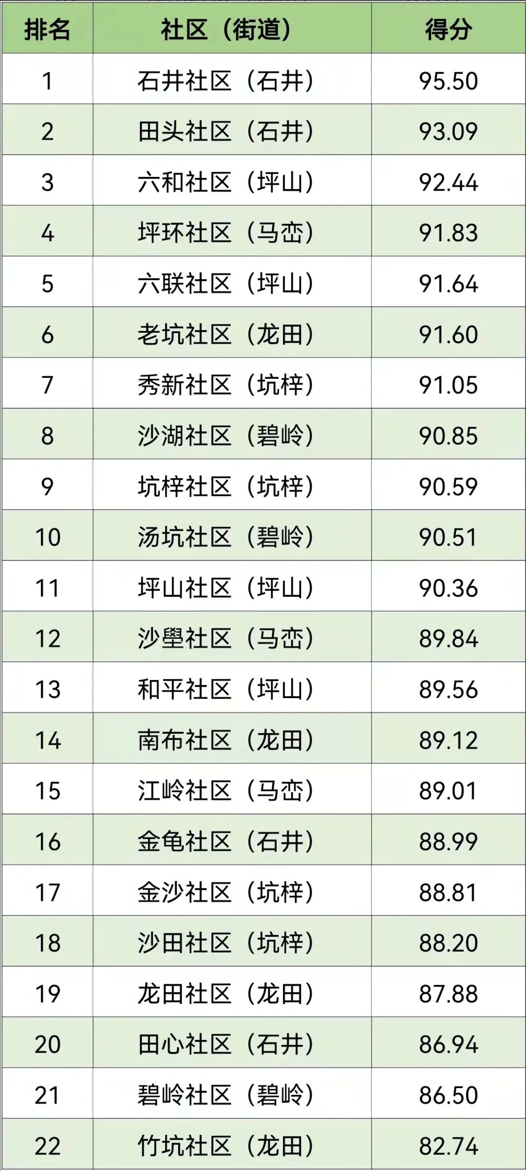 测评结果显示,沙湖社区表现亮眼,排名第一,沙壆社区、老坑社区、田头社区、坪环社区紧随其后,位列前五,而排名靠后的社区要继续加油哦~