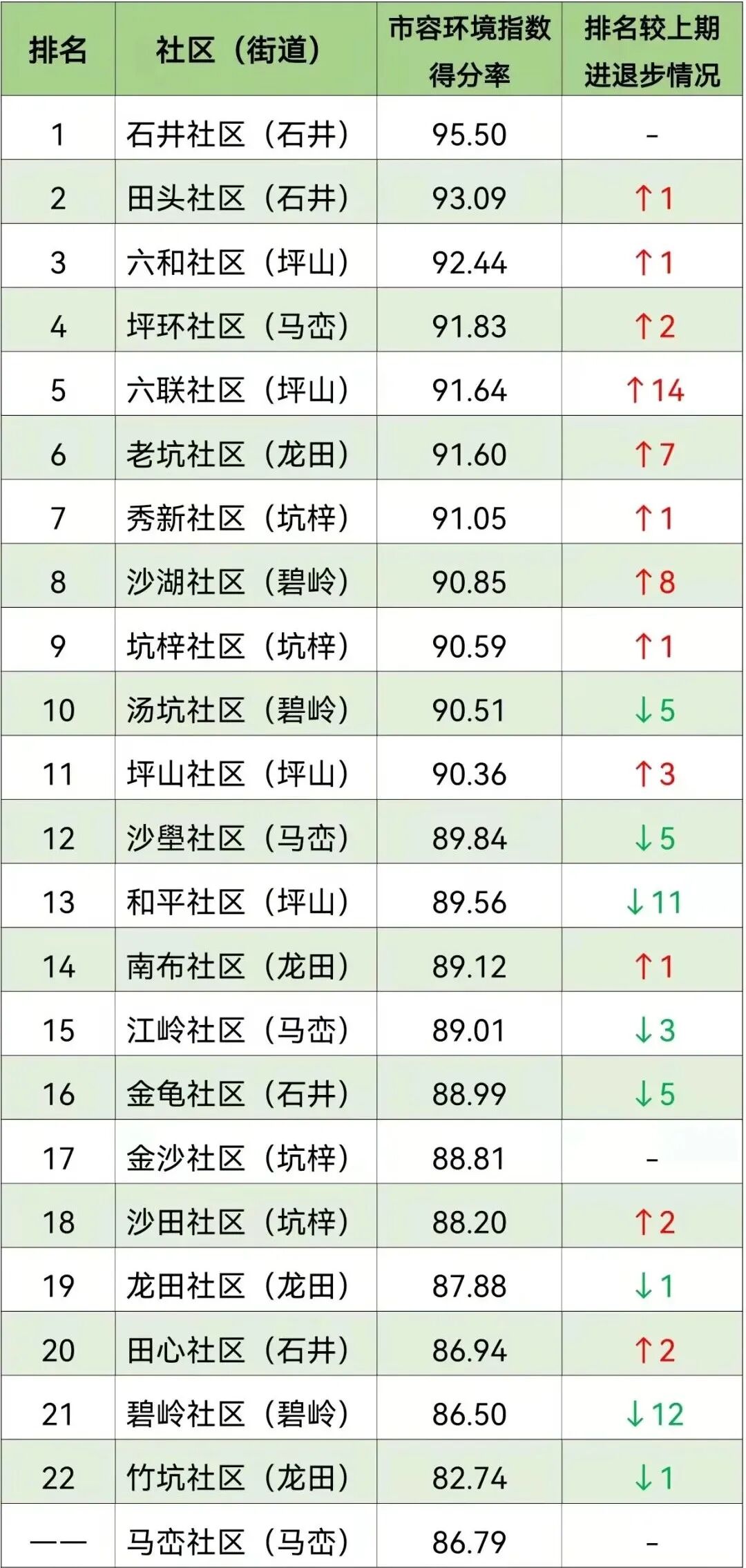为落实社区市容环境主体责任,加强各社区家园意识及居民自治能力,坪山区持续开展社区市容环境指数测评。11月市容环境考核成绩单来了,一起看看吧~