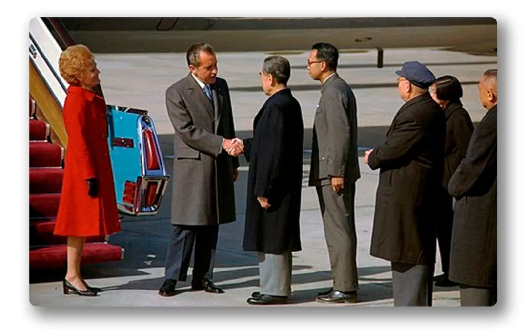 就是在这样的政治氛围中,1972年,尼克松乘坐“空军1号”,到达了中国南苑机场。后来的会面中,毛泽东主席对尼克松总统说,我认为中国跟美国没有根本利益的冲突,直到现在也一样。