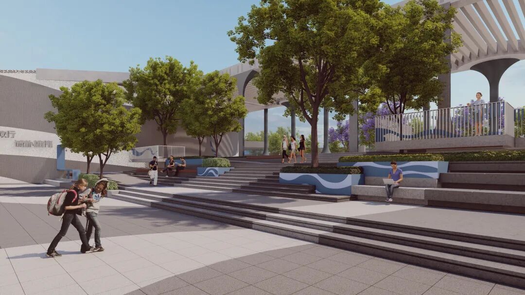 坪山高中园由三所学校组成,三所学校在同一种立面形态和白墙基底下,采用霞红、原木、瓦青三种色调,呼应了传统建筑中红岩、原木和青瓦的运用,也为三所学校赋予了不同的主题特色。除此之外,阶梯屋面、校内庭院等处的造型和空间处理上也融入客家建筑元素,打造一座文化传承、山水共生的百年校园。