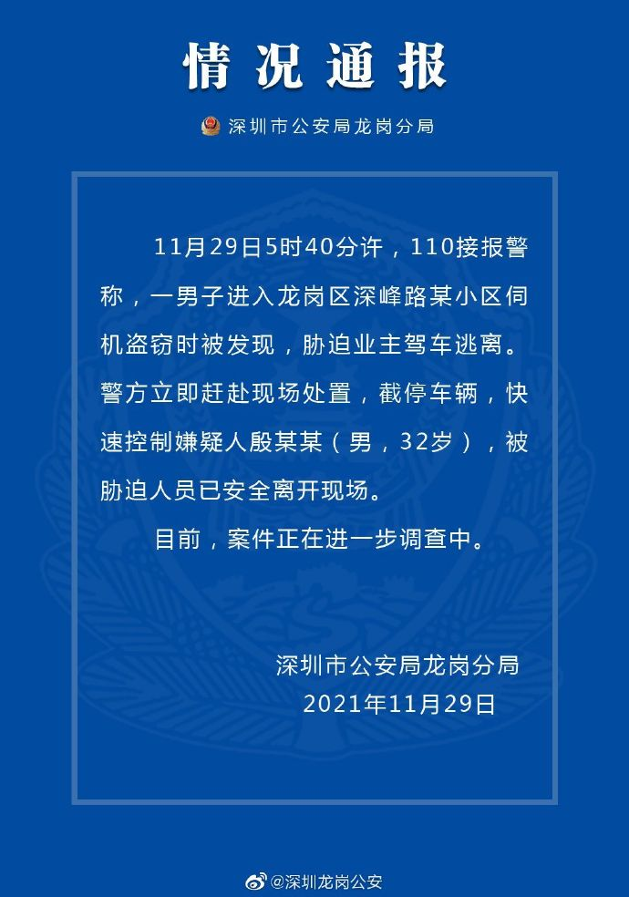 11月29日5时40分许,110接报警称,一男子进入龙岗区深峰路某小区伺机盗窃时被发现,胁迫业主驾车逃离。警方立即赶赴现场处置,截停车辆,快速控制嫌疑人殷某某(男,32岁),被胁迫人员已安全离开现场。