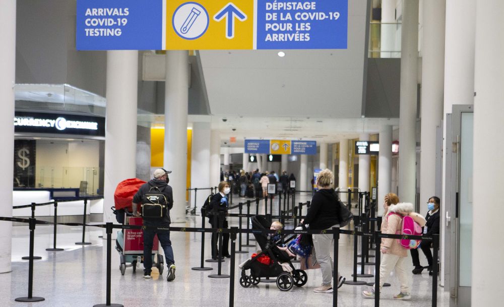 11月28日,在加拿大安大略省多伦多皮尔逊国际机场,戴口罩的入境旅客前往新冠病毒检测站。(新华社发,邹峥摄)