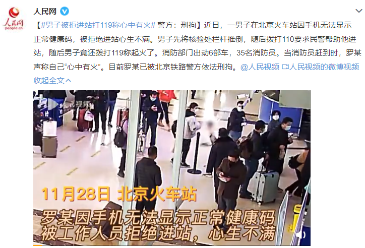 近日,一男子在北京火车站因手机无法显示正常健康码,被拒绝进站心生不满。男子先将核验处栏杆推倒,随后拨打110要求民警帮助他进站,随后男子竟还拨打119称起火了。消防部门出动6部车,35名消防员。当消防员赶到时,罗某声称自己“心中有火”。目前罗某已被北京铁路警方依法刑拘。