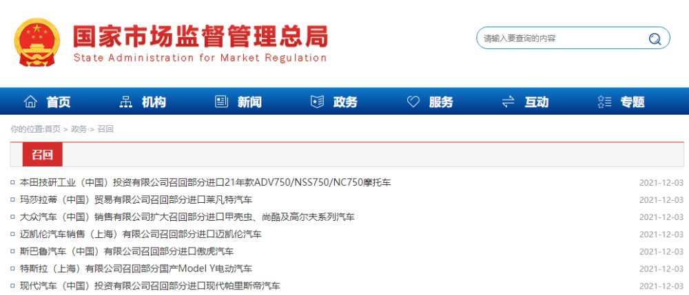 12月3日,据国家市场监督管理总局网站消息,多家汽车公司向国家市场监督管理总局备案了召回计划,将召回部分存在缺陷的汽车产品,详情如下:
