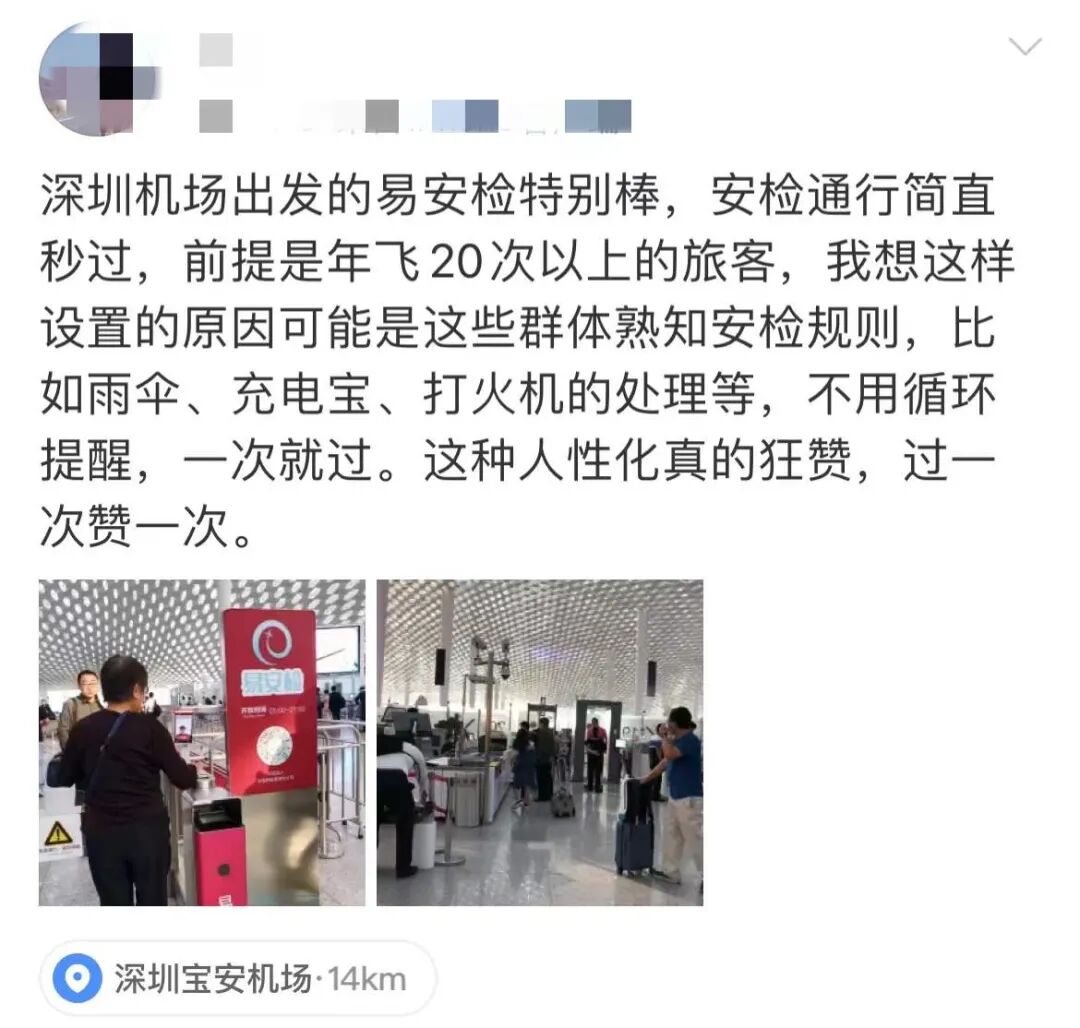 服务推出以来,旅客对深圳机场“易安检”给予充分认可,普遍反馈过检速度快、服务体验佳、安检效果好。经测算,通行效率可以提高30%,理想状态下,旅客过检时间可缩短一半。