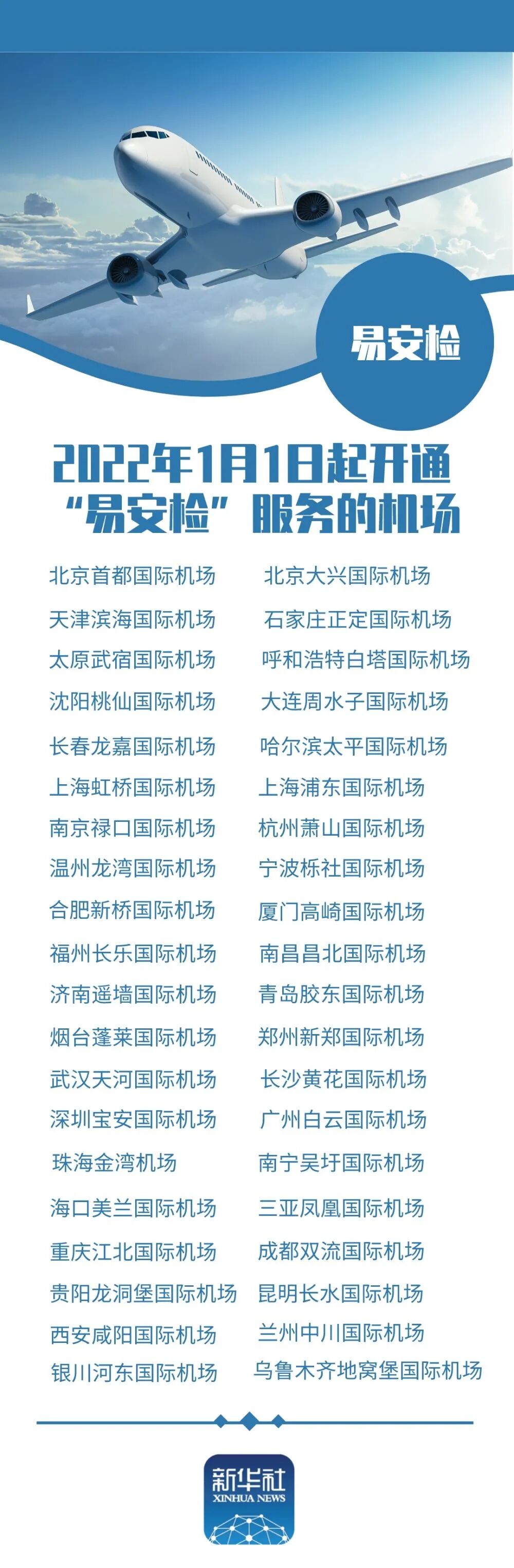 近日,民航局在“我为群众办实事”新闻发布会上向社会公布,为进一步方便广大旅客乘机出行着力提升民航安检系统安全运行效能,自2022年1月1日起,北京、上海、广州、深圳等全国40家旅客吞吐量千万级的大型机场都将开通旅客“易安检”服务。