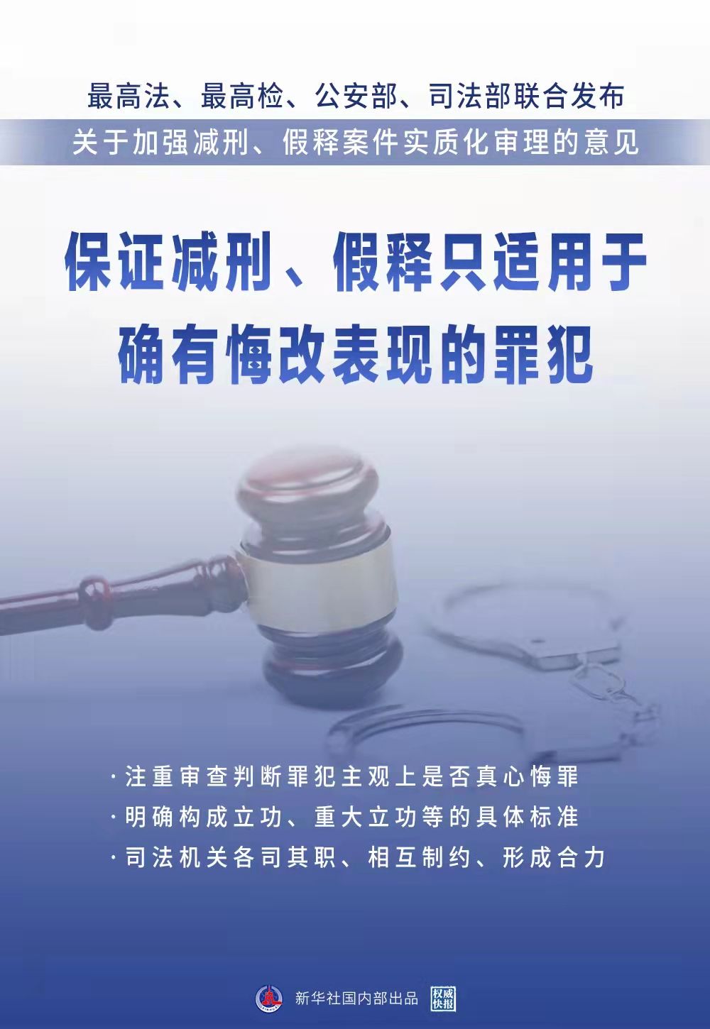 最高法、最高检、公安部、司法部8日联合发布关于加强减刑、假释案件实质化审理的意见,从准确把握实质化审理基本要求、严格审查实体条件等方面进一步细化工作要求,保证减刑、假释只适用于确有悔改表现的罪犯。