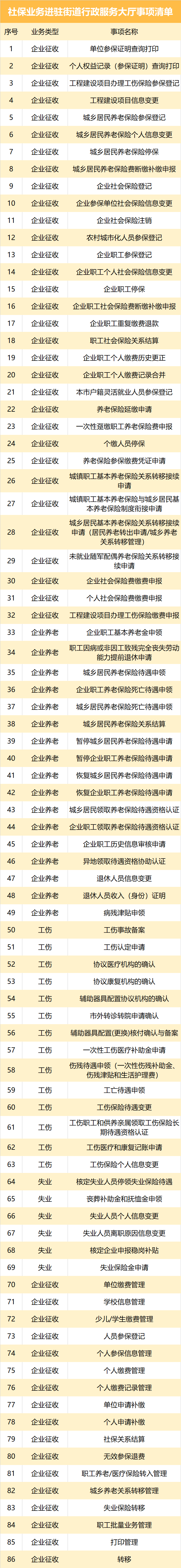跟前两批的街道大厅一样本次进驻的社保业务有以下86项