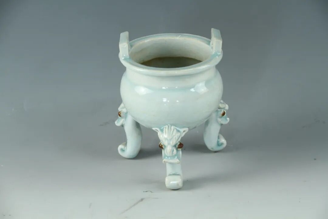 宋湖田窑青白釉兽面三足双立耳炉
