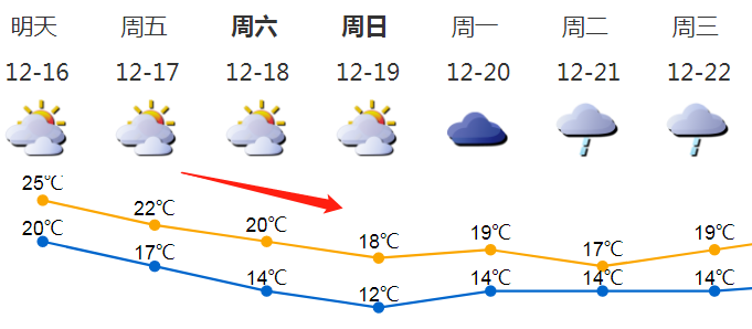 17-19日受冷空气影响,大致多云;北风加大,沿海、海区和高地最大阵风8级左右;气温明显下降,19日最低气温12℃左右,天气干冷。
