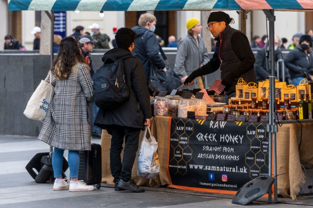 12月16日,人们在英国伦敦一家摊位前选购商品。(新华社发,雷伊·唐摄)