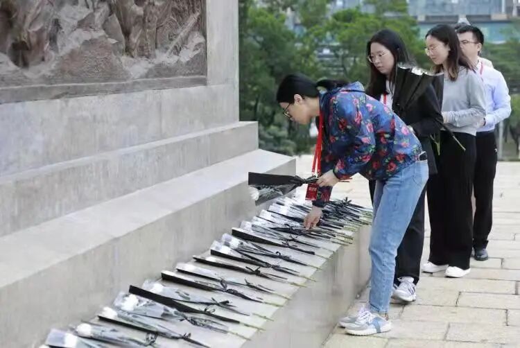 福田站,记者们向纪念碑献花