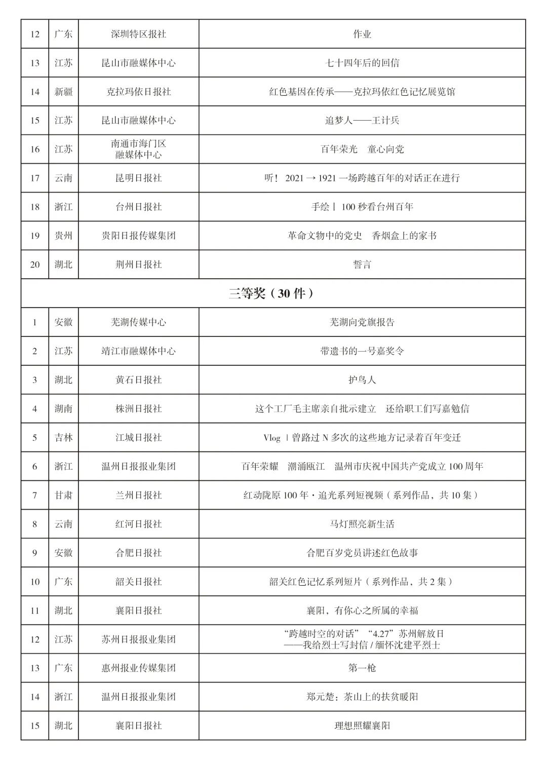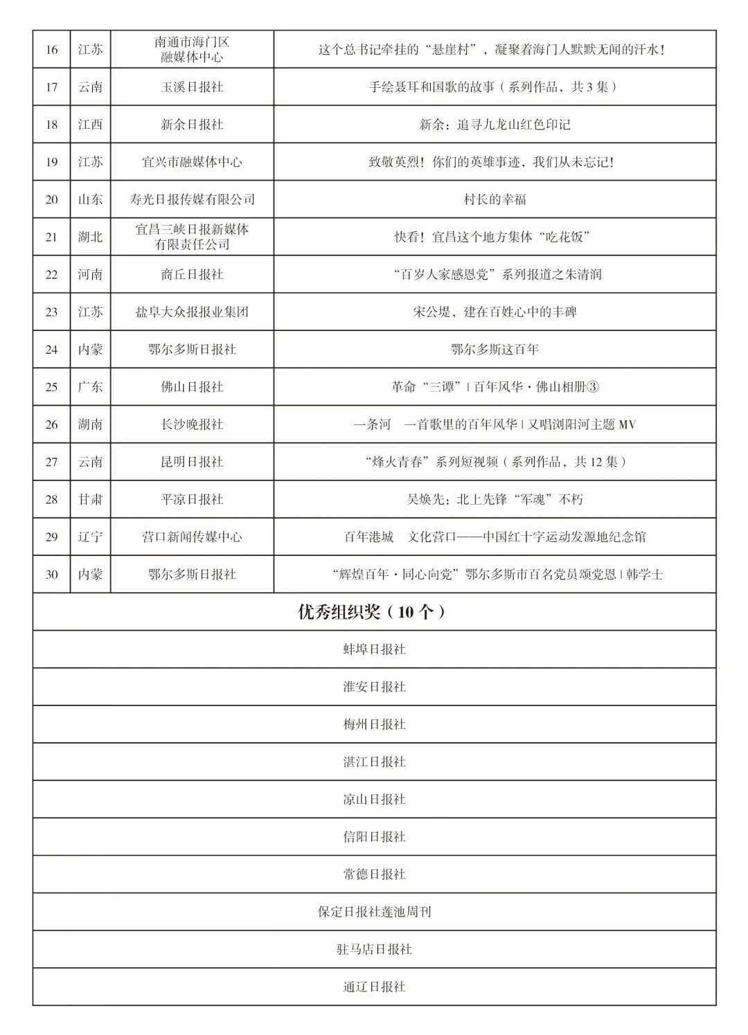 为聚合各地党报,充分反映建党百年以来各地发生的翻天覆地的变化和发展成就,同时庆祝《城市党报研究》杂志创刊20周年,中国报业协会党报分会、《城市党报研究》杂志社主办,柳州日报社承办了广西金嗓子杯“百年荣光”城市党媒短视频大赛。经过认真组织,如今圆满收官,共评出10个一等奖、20个二等奖、30个三等奖以及10个优秀组织奖。