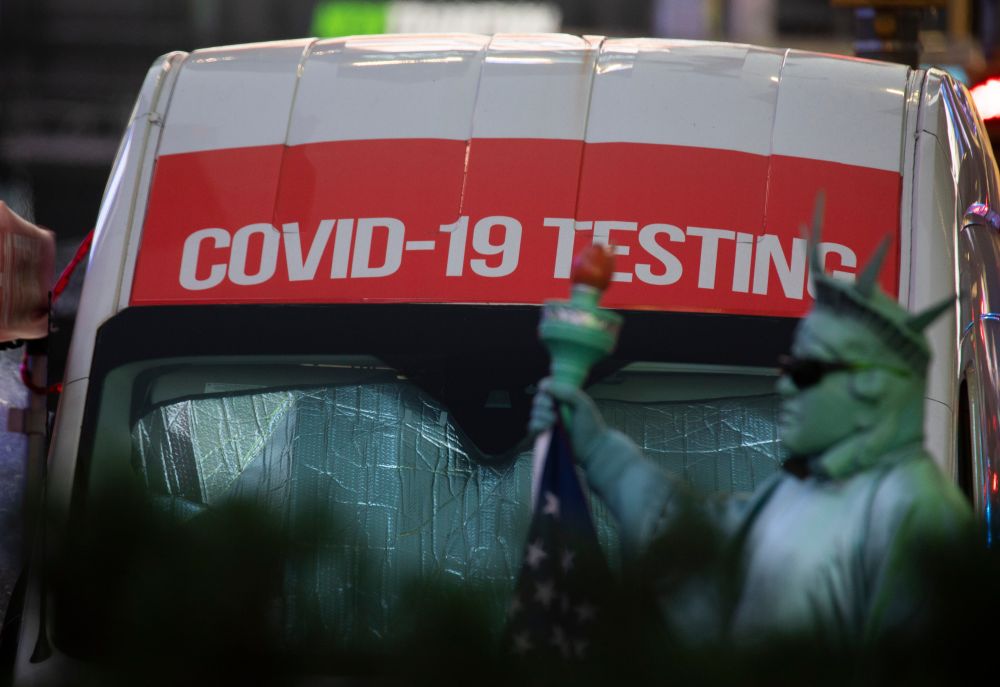 12月20日,一名街头演员在美国纽约时报广场一处临时核酸检测点旁表演。美国疾病控制和预防中心网站当日公布的新冠疫情模型数据显示,奥密克戎已取代德尔塔毒株成为在美主要流行毒株。