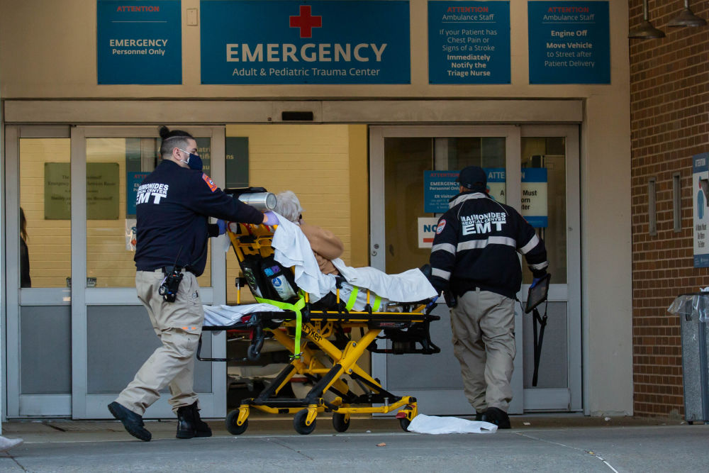 12月14日,在美国纽约,工作人员将一名病人送入医院。