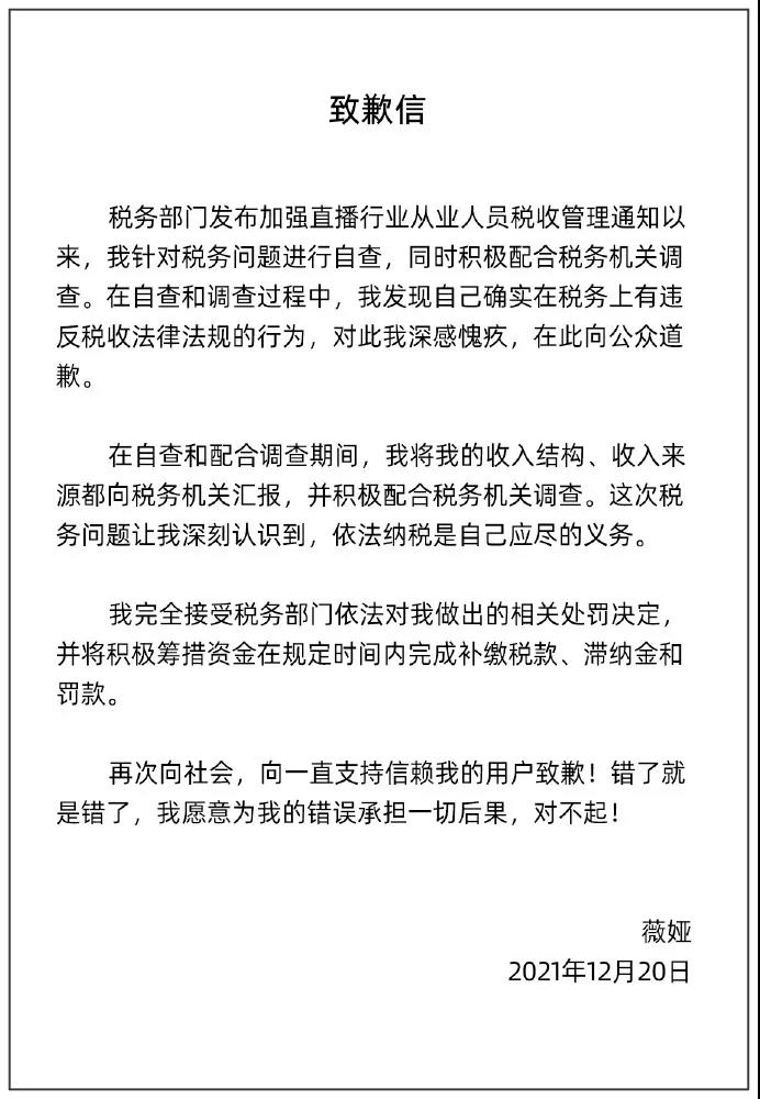 对此,薇娅发布致歉信称,完全接受税务部门依法对其作出的相关处罚决定,并将积极筹措资金在规定时间内完成补缴税款、滞纳金和罚款。薇娅称,愿意为自己的错误承担一切后果。