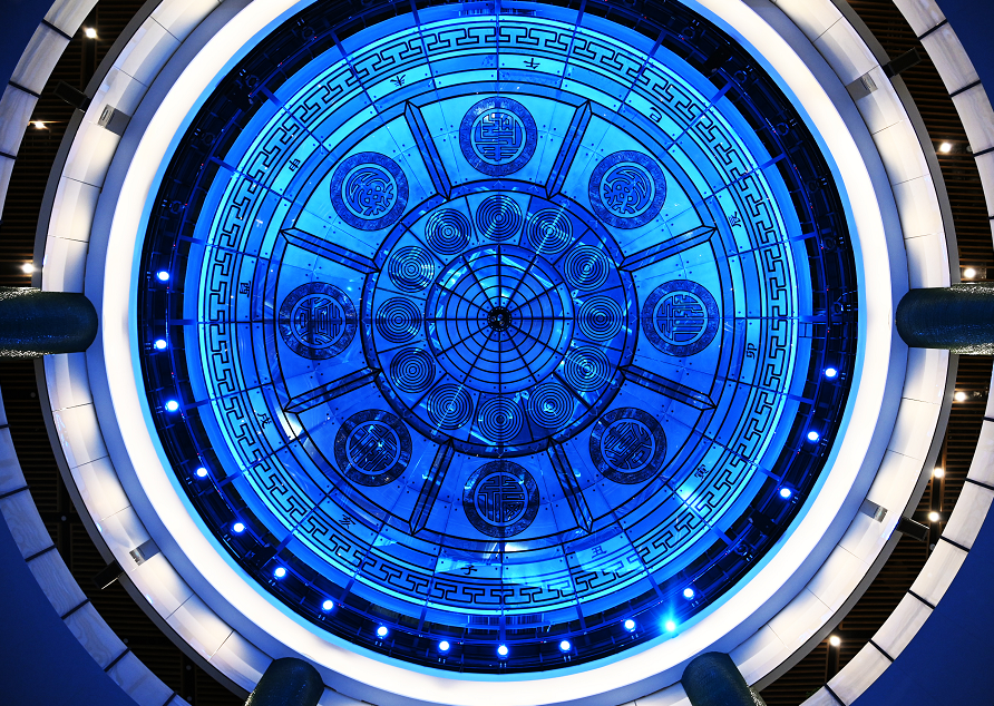 大厅的穹顶。结合“日晷”的造型设计,当阳光从穹顶的玻璃天窗投到地面时,光线如时针般一格一格移动,24小时循环往复。靳军摄