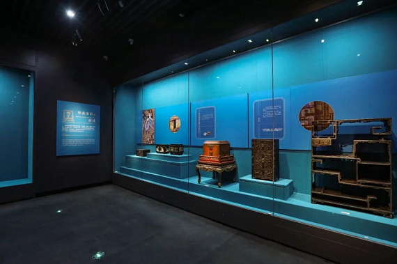 例如,一层为沈阳故宫专场,背景色选用金红琥珀色,既可以使用色彩反差将文物衬托出来,又与宫廷精美华贵的展品特质相呼应;家具展厅中文物为清宫家具,多以檀木为主,遂采用宫廷蓝为背景,衬托出皇家的富丽堂皇。