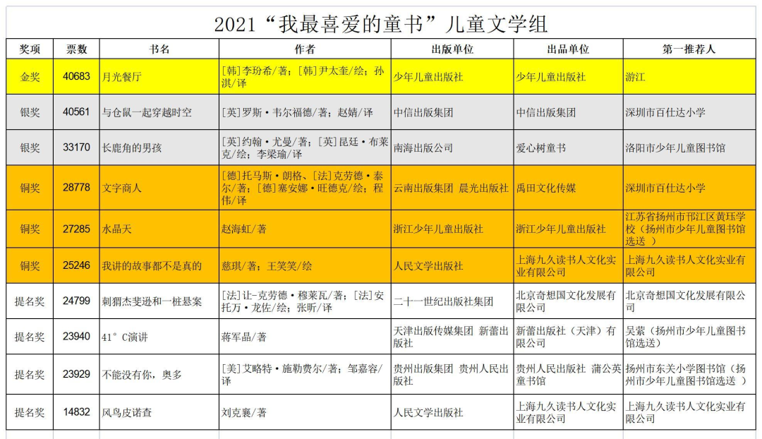 《月光餐厅》获儿童文学组金奖,《与仓鼠一起穿越时空》《长鹿角的男孩》获儿童文学组银奖,《文字商人》《水晶天》《我讲的故事都不是真的》获儿童文学组铜奖。