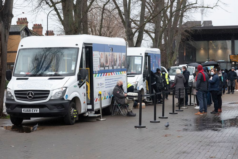 2021年12月6日,在英国伦敦,人们在新冠疫苗接种车旁排队等待。