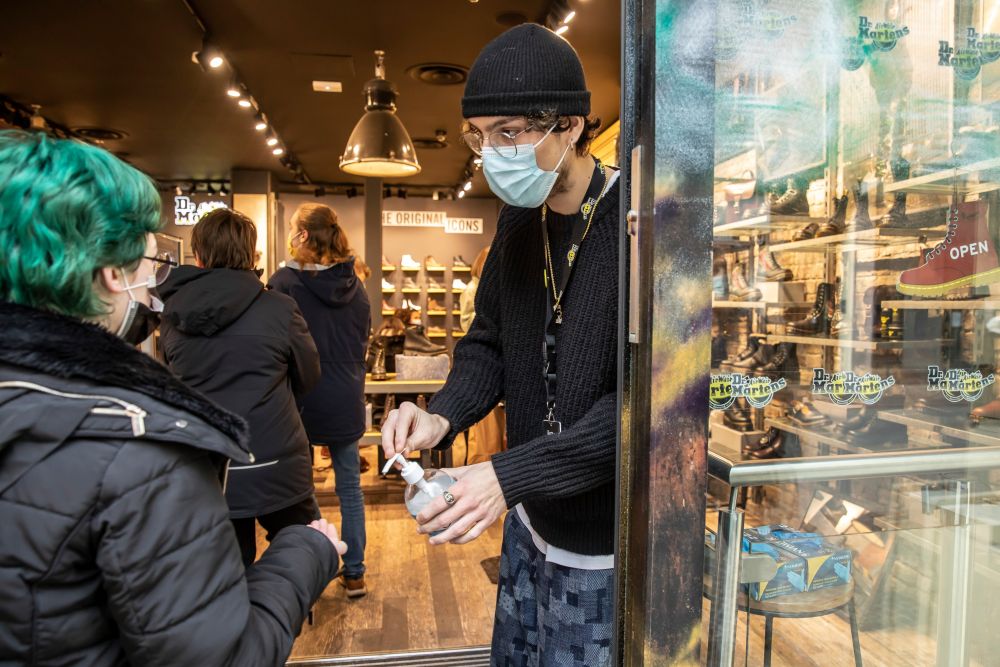 2021年12月22日,在法国北部城市里尔,商店店员为顾客提供消毒洗手液。