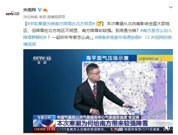 本次寒潮从北向南影响全国大部地区,但降雪在北方地区不明显,南方降雪却较强。到底是为啥?南方是怎么加入降雪群聊的 ?一起听听专家怎么说。