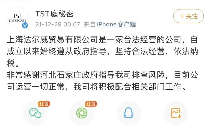 对此,TST庭秘密29日在官方微博回应称,上海达尔威是一家合法经营的公司,自成立以来始终遵从政府指导,坚持合法经营,依法纳税。非常感谢河北石家庄政府指导公司排查风险,目前公司运营一切正常,公司将积极配合相关部门工作。